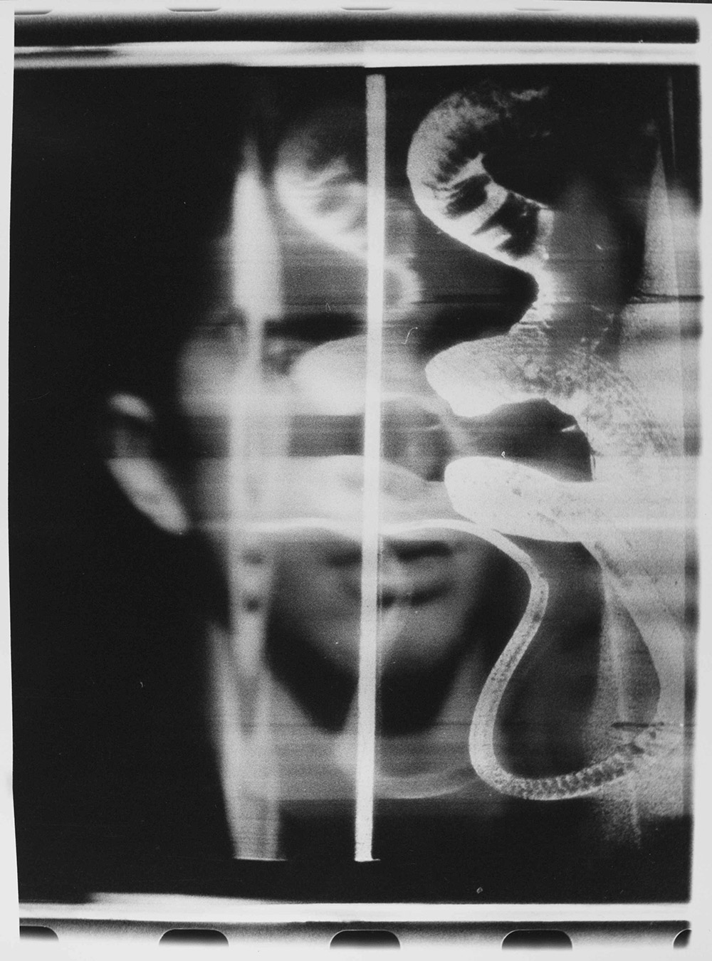 Una tecnica il fotofinish, che ho iniziato a utilizzare e reinventare nei primissimi anni settanta. La linea-fessura tradizionale posta nella finestrella d’entrata della fotocamera viene sostituita da un frammento d’immagine fissa attraverso la quale viene ripreso, sempre con pellicola 35mm, un volto in movimento che si troverà in “combutta” con e decostruito da, l’immagine fissa: le nature, appunto, riprese nel Museo Spallanzani.